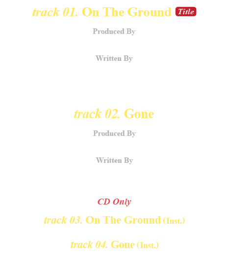 The title track ‘On The Ground’ was produced by global producers from overseas, including Jorgen Odegard and ojivolta, along with The Black Label’s representative producers, TEDDY and 24. The mystic sounds with lingering tension create harmony with ROSÉ’s unrivaled smooth vocals, presenting a new sense of satisfaction for the listeners. The lyrics, which state that we've always run towards a higher place, but the important value is within ourselves, make us realize the things we were missing as we live in this era.